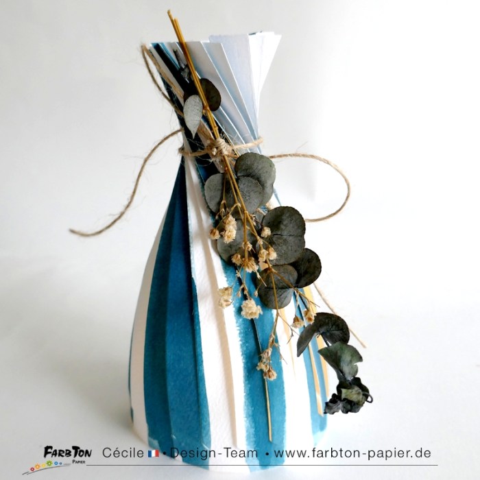 Je me suis tellement amusée à réaliser la première série de photophores colorés en jouant avec les aquarelles liquides « Ecoline » (Disponibles chez Farbton Papier) que je n’ai pas résisté à la tentation d’un ajouter un à ma collection, en bleu cette fois. J’ai juste ajouté quelques fleurs séchées (une branche d’eucalyptus et un peu de gypsophile)