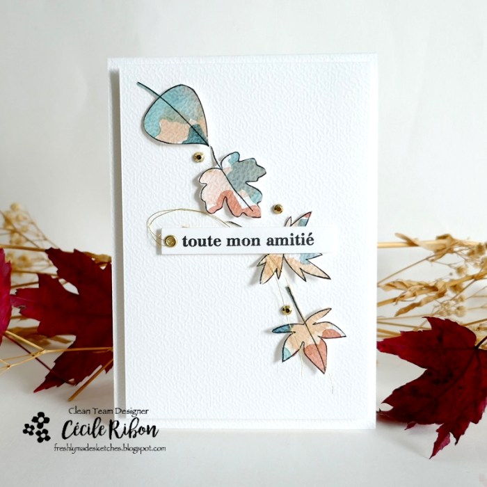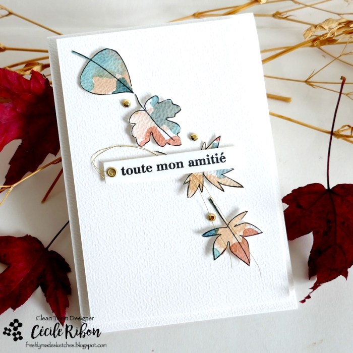 Once again, I’m very late in announcing this week’s Freshly Made Sketches challenge, but there’s still time to come and play along with us and interpret the super fun sketch Michele has designed especially for you. I chose to go with some falling autumn leaves to send friendly thoughts.