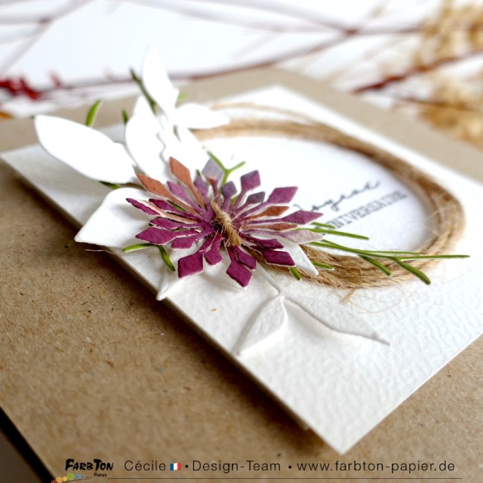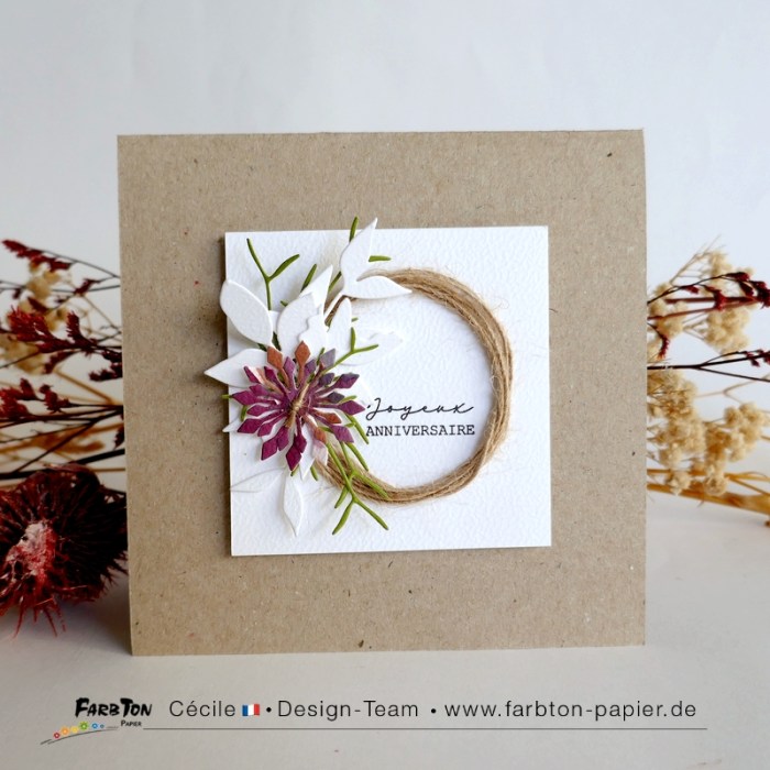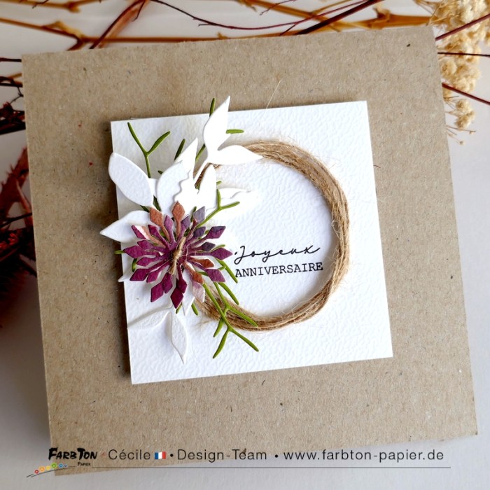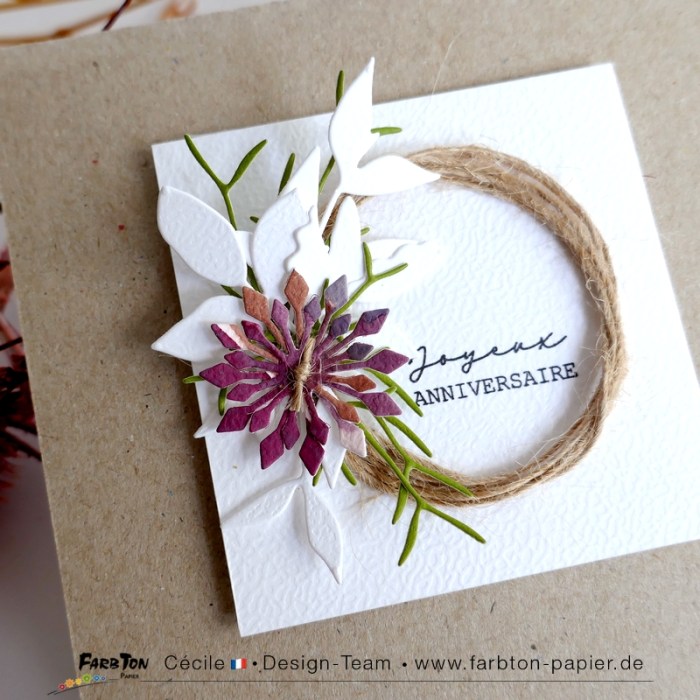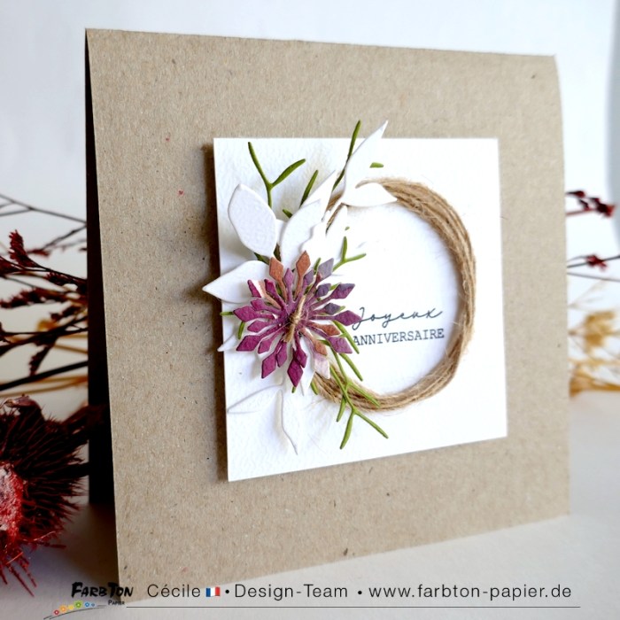 Una carte d’anniversaire réalisée avec les nouveaux sets de matrices de coupe « Feuillages » de   Farbton Papier . Il y a pas moins de 4 sets et, dans chaque set, un ensemble de feuillages de différentes tailles,  conçus pour pouvoir être superposés ou non, car ils sont également parfaits utilisés indépendamment . C’est d’ailleurs l’option que j’ai retenue en piochant différents éléments dans 2 des 4 sets.