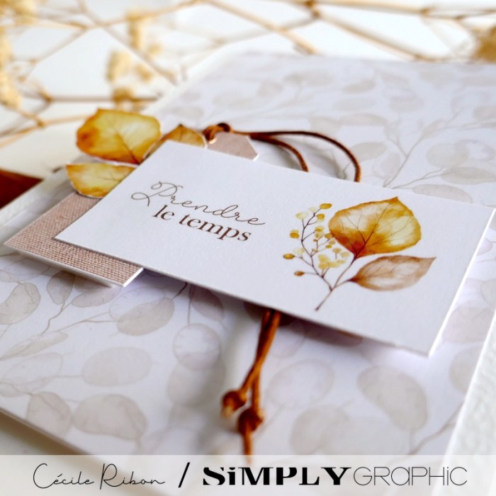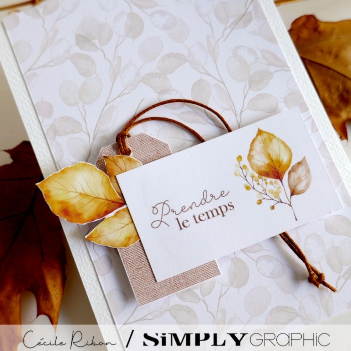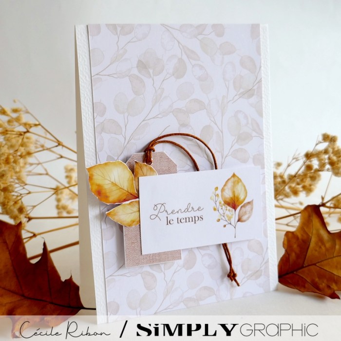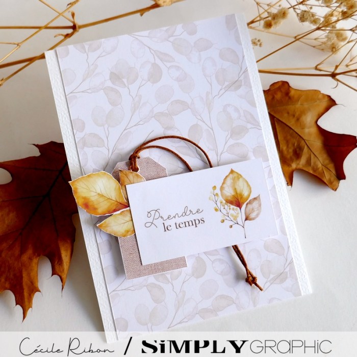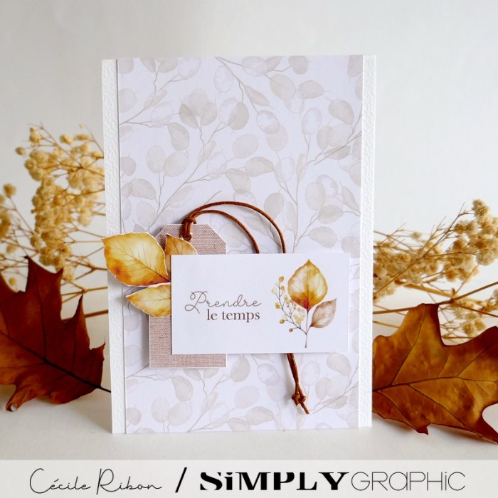 Pour ce soir ce sera encore une carte toute simple à l’atmosphère résolument automnale et réalisée avec un papier imprimé et quelques uns des très jolis tags et motifs à découper du kit créatif de la capsule d’automne de Simply Graphic.