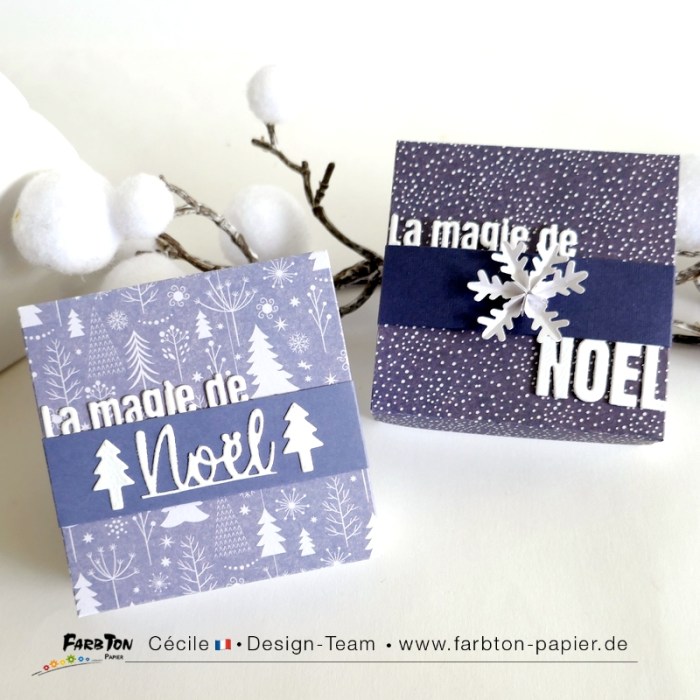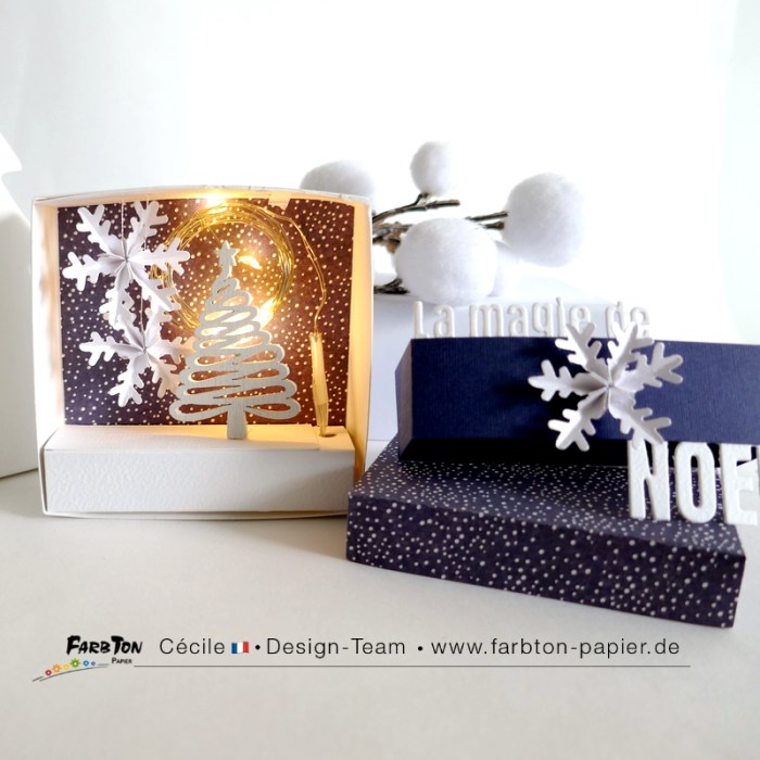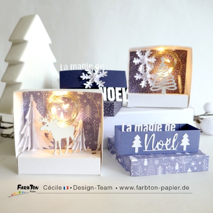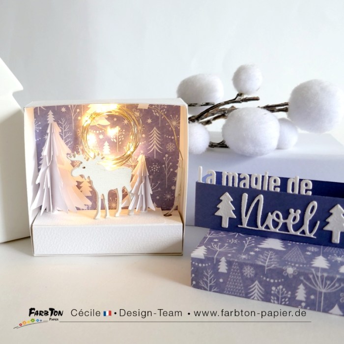 Cette fois, j’ai mis en scène la phrase « La magie de Noël » ainsi que le mot seul ‘NOEL ». J’ai confectionné non pas une mais deux nouvelles mini-scènes de Noël dans des petites boîtes en ajoutant des mini-guirlandes LED pour un côté encore plus magique. La boîte mesure 8cm de côté (c’est donc du mini-format) et je l’ai réalisé avec une autre nouveauté, un set très complet pour confectionner ces petites boîtes carrées. Il contient plusieurs matrices de coupe, pour la boîte en elle même, pour le couvercle, pour le bandeau de maintient et aussi différents éléments de décoration, dont les mini-flocons décorant l’une des deux boîtes.