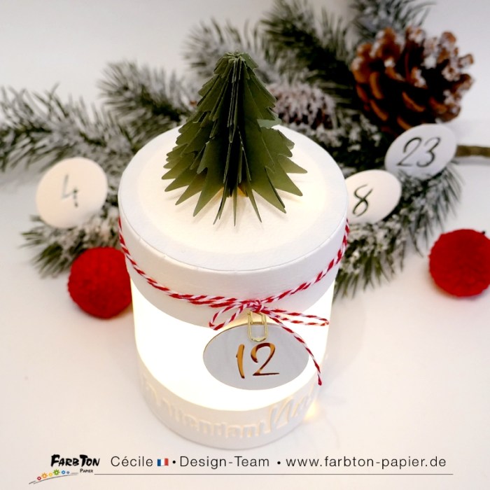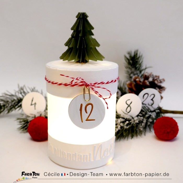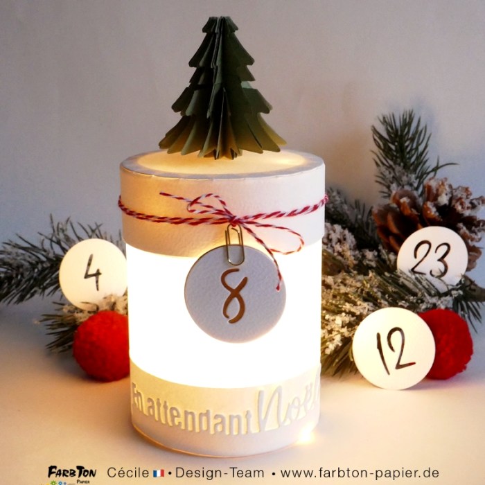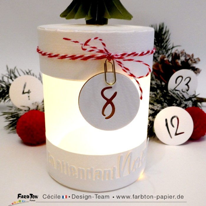 Encore une décoration de Noël lumineuse réalisée avec des matrices de coupe Farbton Papier , J’ai transformé une boîte cylindrique en calendrier de l’Avent, en remplaçant une partie du corps de la boîte par du calque pour laisser passer la lumière et en ajoutant une petite étiquette portant le numéro du jour.