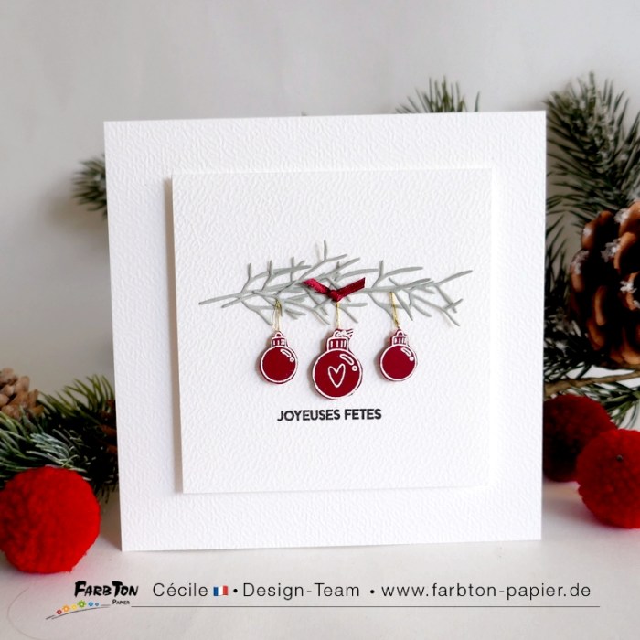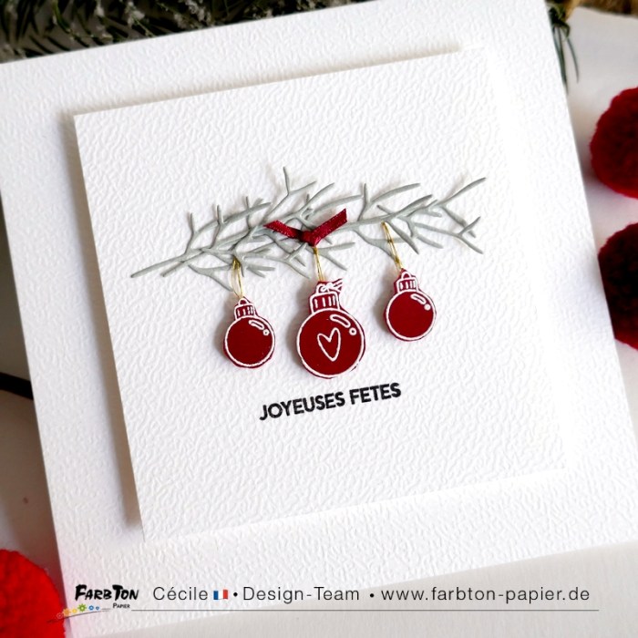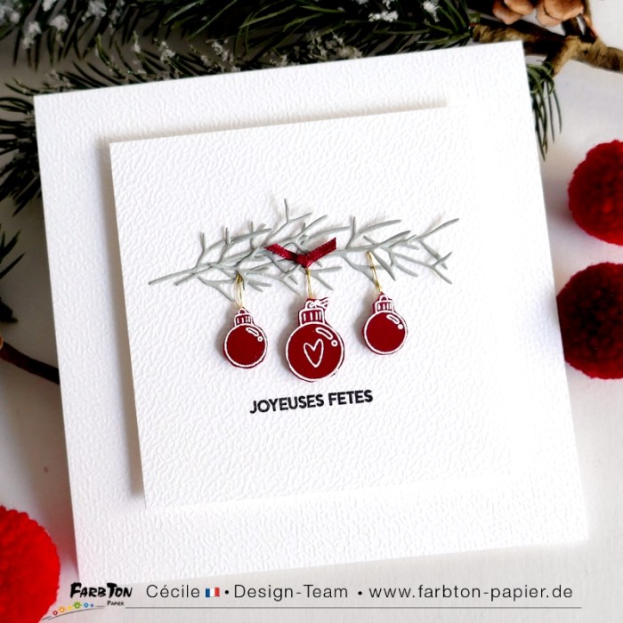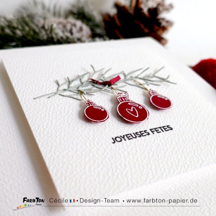 Cette fois j’ai associés les tampons (embossés à chaud sur du papier rouge profond et détourés) à des matrices de coupe brindille. J’ai superposé les découpes afin de figurer une banche de pin à laquelle j’ai suspendu les boules avec un peu de fil or. Un petit nœud de ruban et un sentiment complètent la composition.