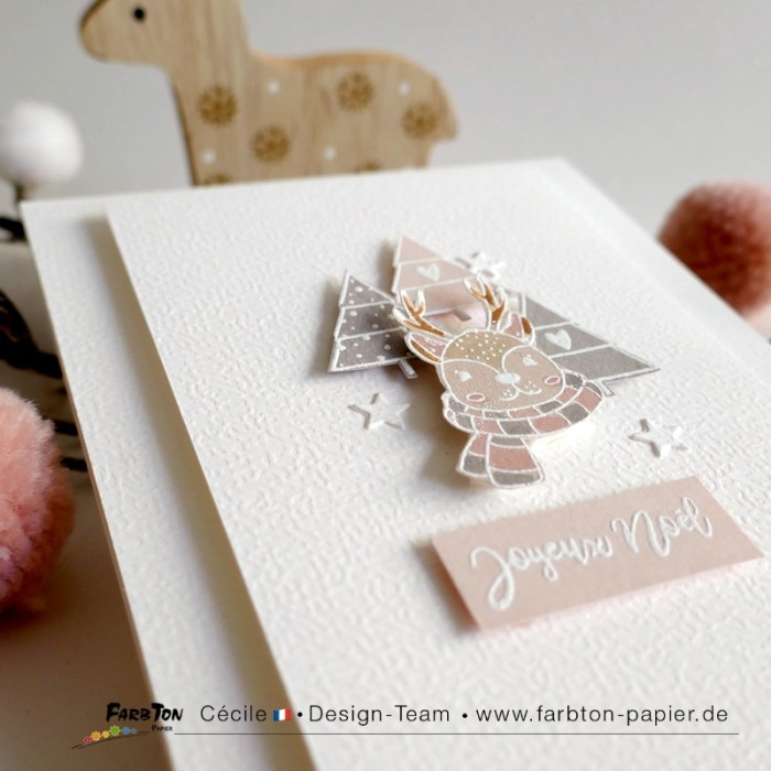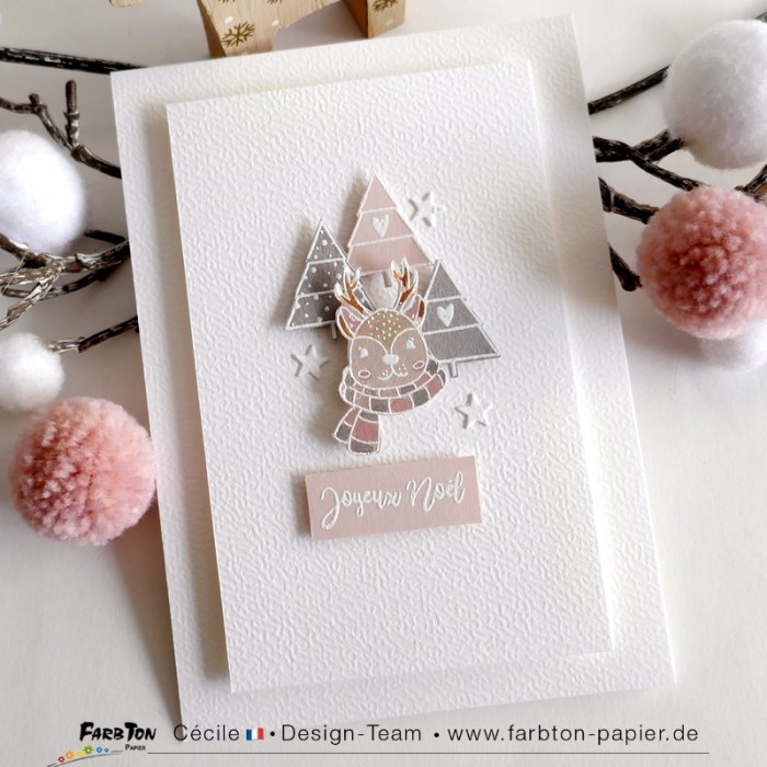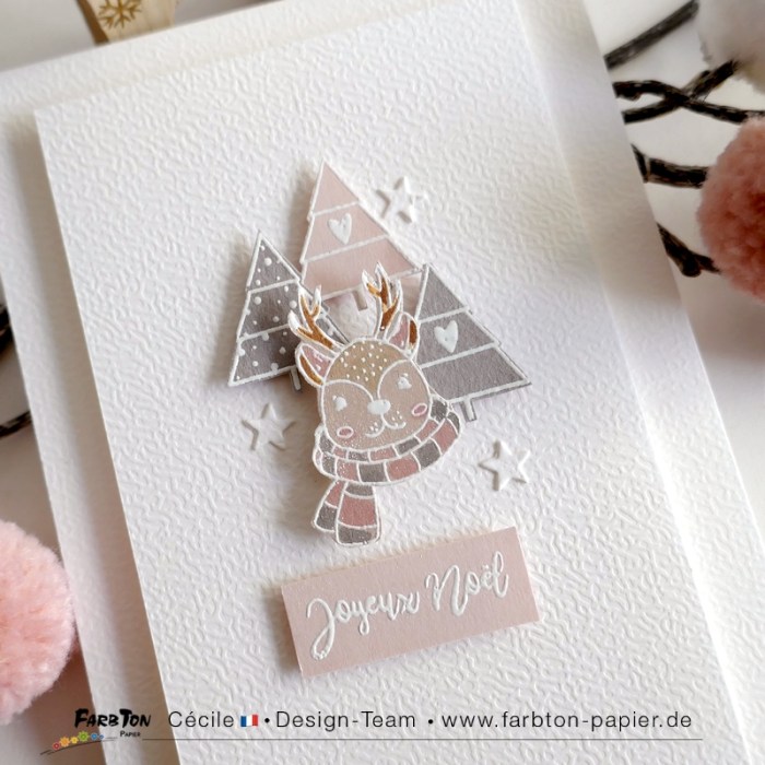Cette fois, j’ai eu envie d’un carte toute douce, enfantine même, et j’ai donc opté pour des couleurs très tendres, du rose poudré, du gris souris et une pointe de taupe (pour le petit renne). Les tampons sont embossé à chaud sur des papiers colorés, puis détourés.
