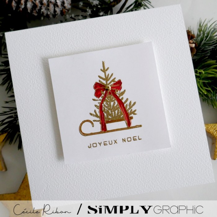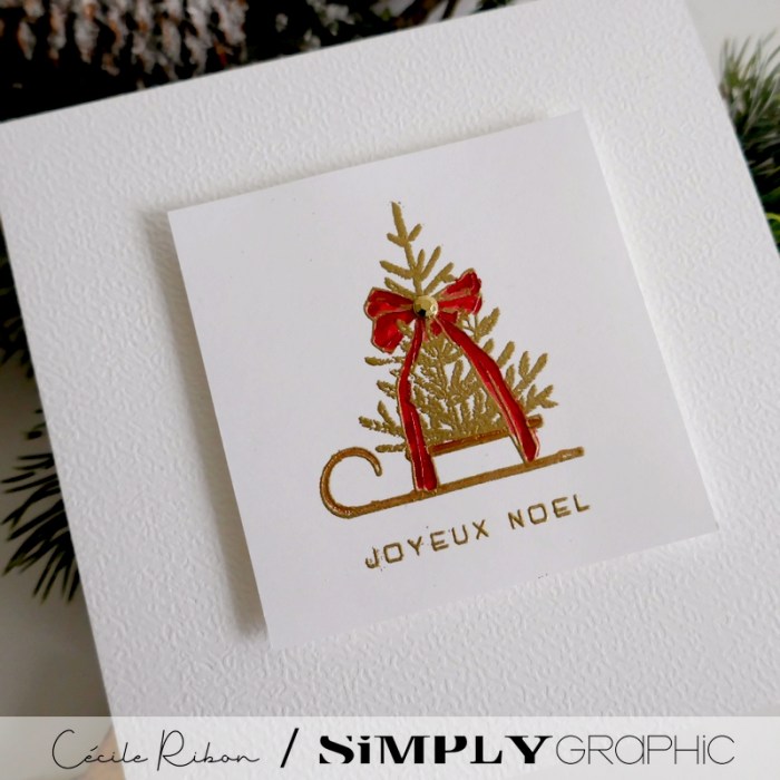 Lorsqu’un tampon fait une carte quasiment à lui seul … C’est ici le cas de ce superbe tampon de la collection Noël 2025 de Simply Graphic. Embossé en or et partiellement aquarellé, cet élégant sapin se suffit presque à lui même. Un sentiment, un mini dot or et voici une carte minimaliste mais malgré tout un brin précieuse …