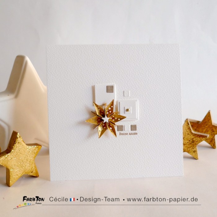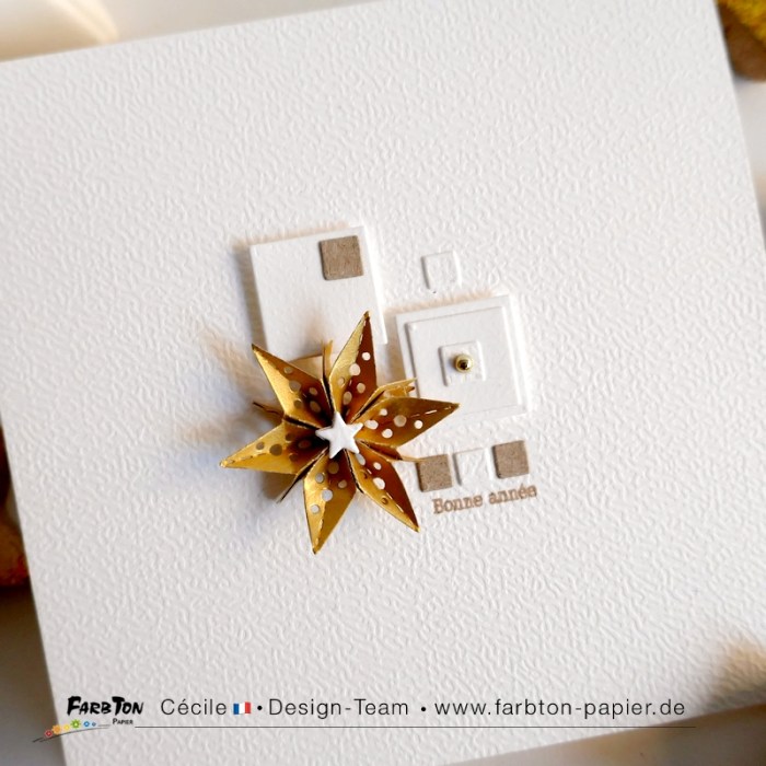 Pour commencer cette nouvelle année, voici une carte de vœux réalisée avec des matrices de coupe Farbton Papier dont le set « Mosaïque » comportant tout un ensemble de formes géométriques à assembler et utiliser à sa guise. Très utiles pour créer des fonds structurés.