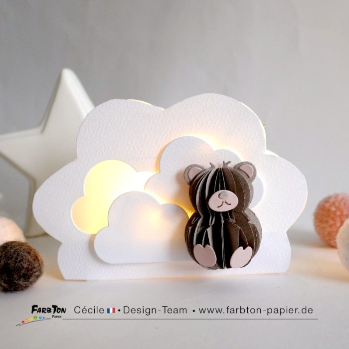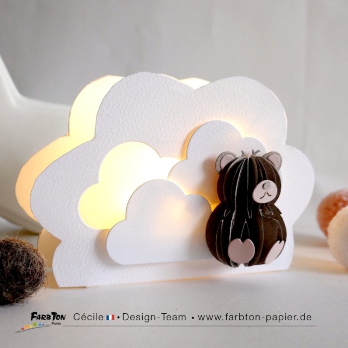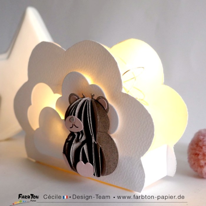 L’ourson est réalisé avec un set de matrices de coupe Farbton Papier (voir liste des produits sous les photos). La structure en forme de nuage est un bricolage maison.