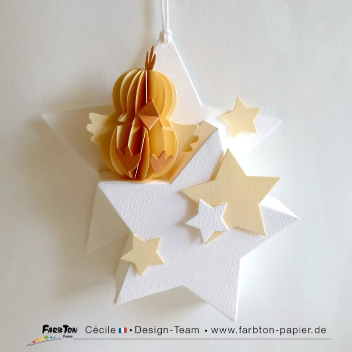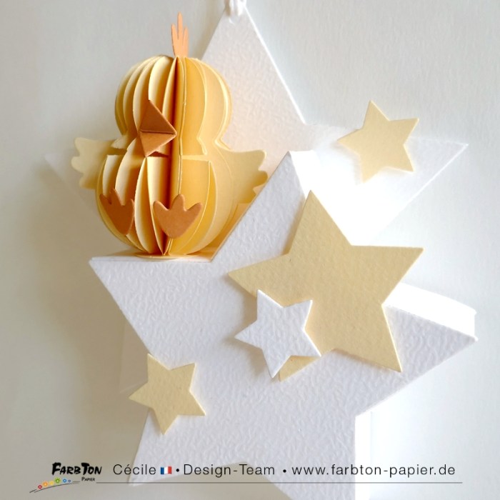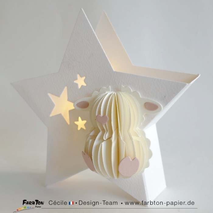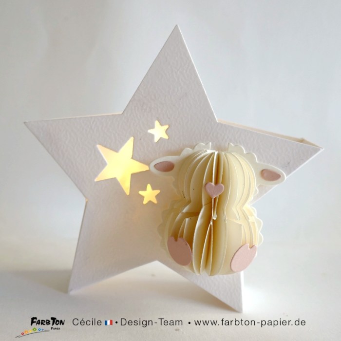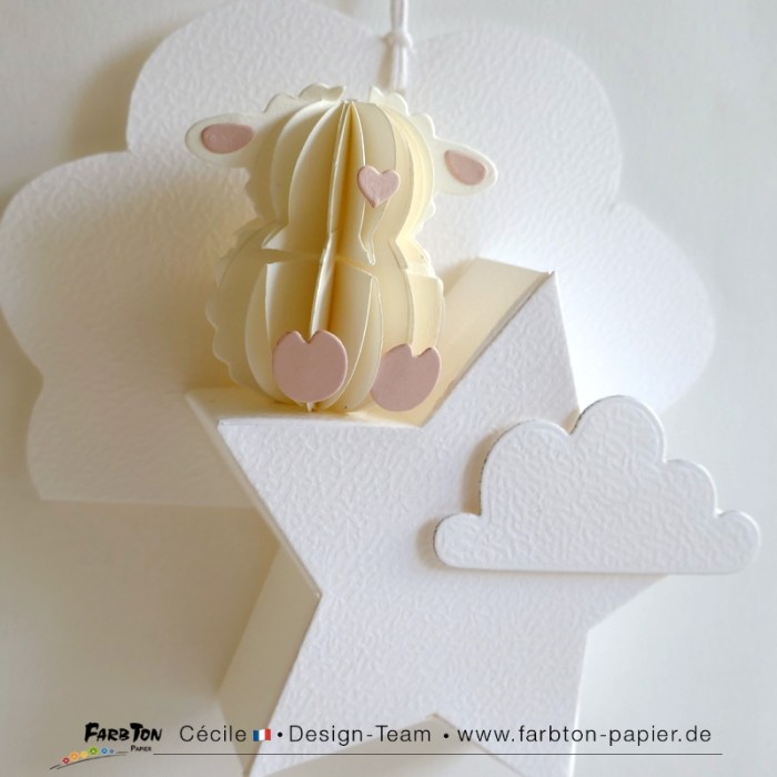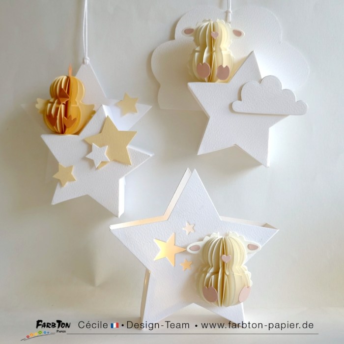 Je me régale à réaliser de tendres décorations pour chambre de bébé. Après les lunes et les nuages, j’ai, cette fois, imaginé deux suspensions et une décoration lumineuse sur le thème des étoiles avec d’adorables petites « bestioles », un poussin et des agneaux, réalisées avec un set de matrices de coupe Farbton Papier (voir liste des produits sous les photos).