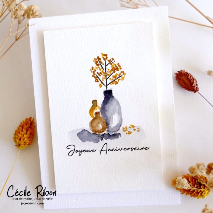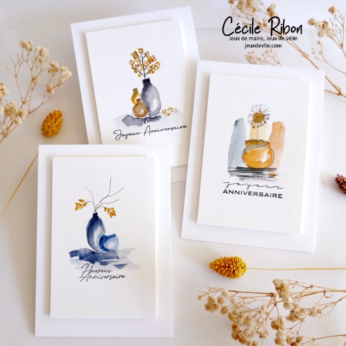 Je partage un ensemble de trois cartes d’anniversaire réalisées pour le seul plaisir de jouer avec mes aquarelles, sans matrices de coupe ni tampons (sauf pour le sentiment) et juste un feutre noir pour ajouter quelques petits détails et apporter de la profondeur.