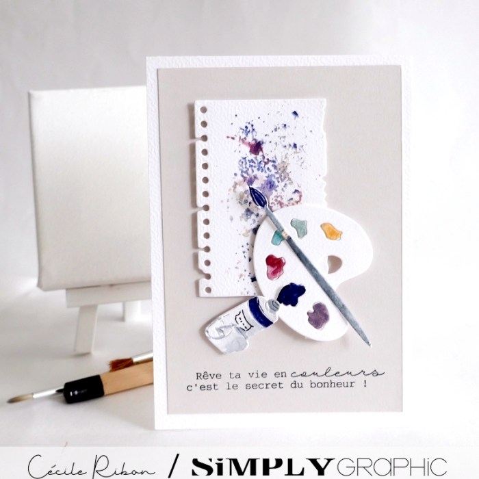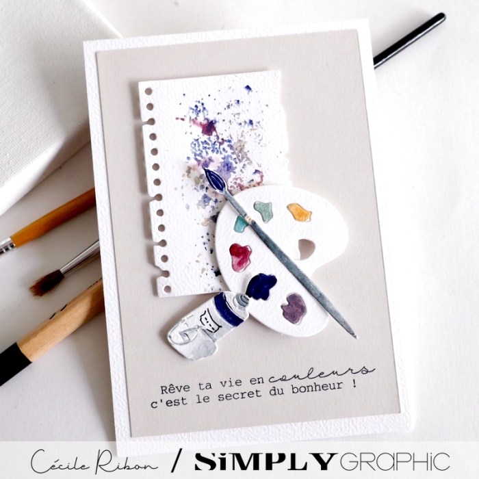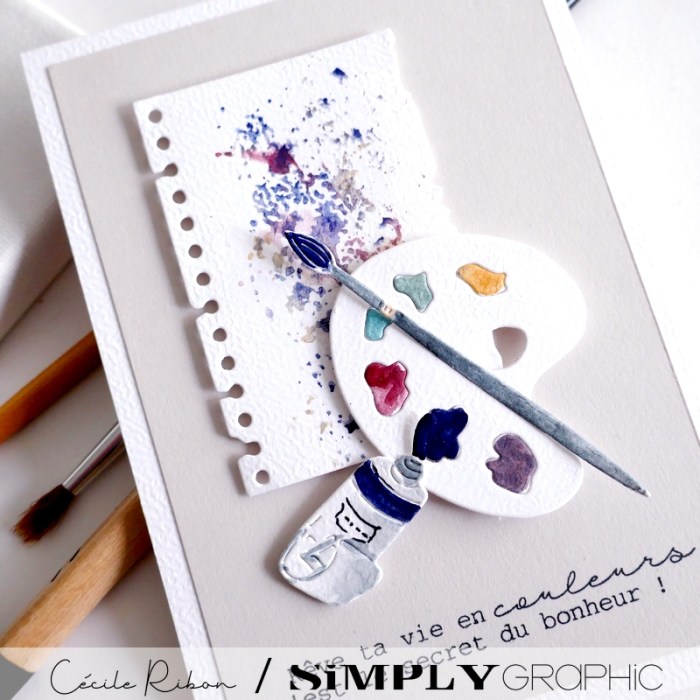 Parmi les pépites de la collection de printemps de Simply Graphic, il y a un très chouette set de matrices de coupe « Outils d’artiste ». C’est un thème qui me parle particulièrement, alors, forcément, je n’ai pas résisté au plaisir de les mettre en scène sur une carte dédie au bonheur de jouer avec les couleurs …
