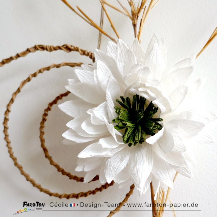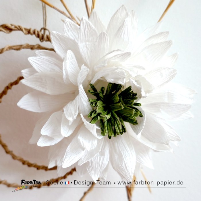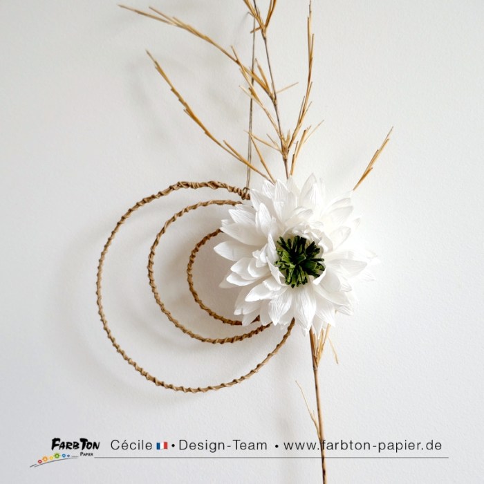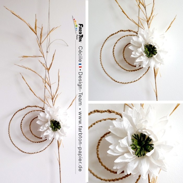 Pour changer des cartes, j’aime beaucoup créer des décorations murales avec les matrices de coupe « fleur » de Farbton Papier . Pour celle que je vous présente aujourd’hui, j’ai confectionné une structure avec de la ficelle armée en façonnant plusieurs cercles et en les imbriquant. J’ai ensuite ajouté une branche de bambou séchée et une grosse fleur en papier crépon réalisée avec différentes matrices de coupe (Voir la liste des produits utilisés sous les photos)