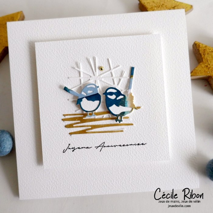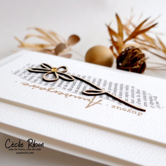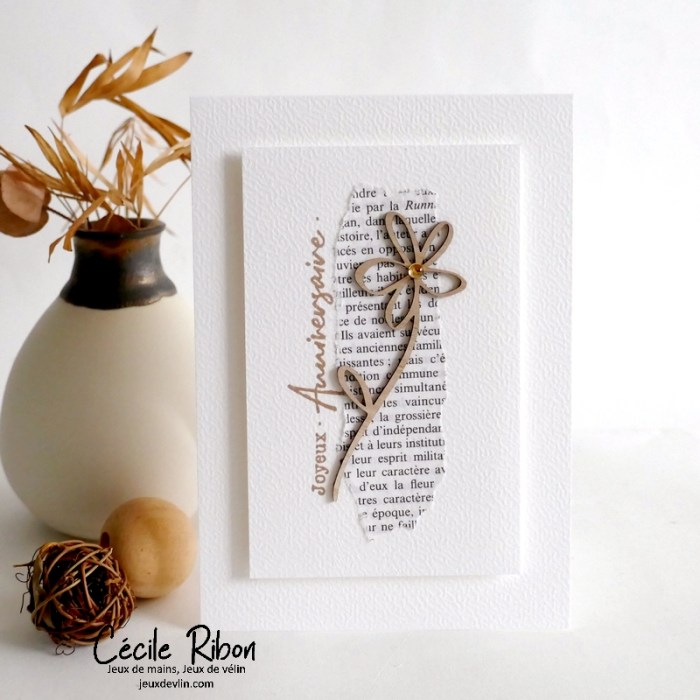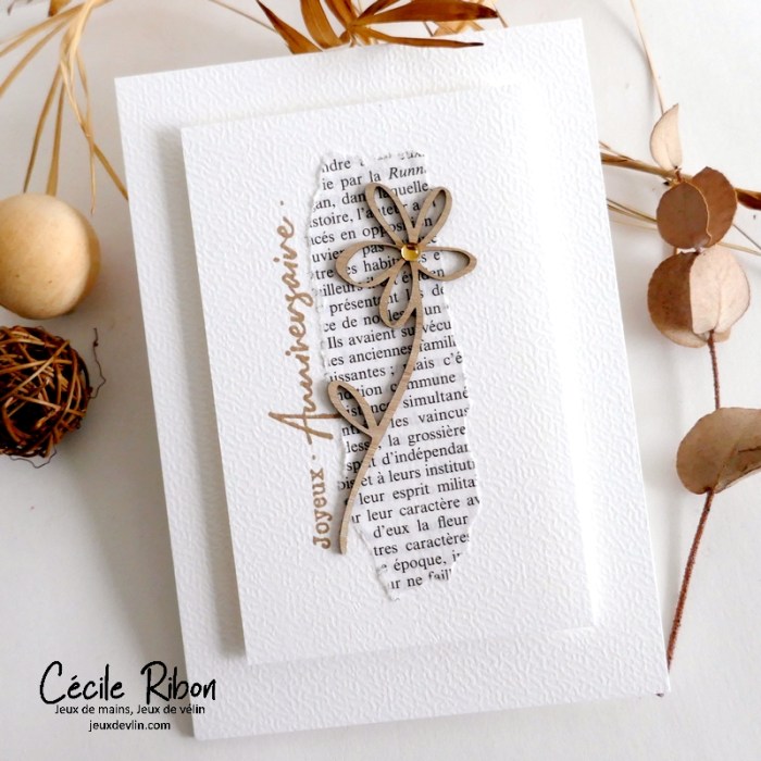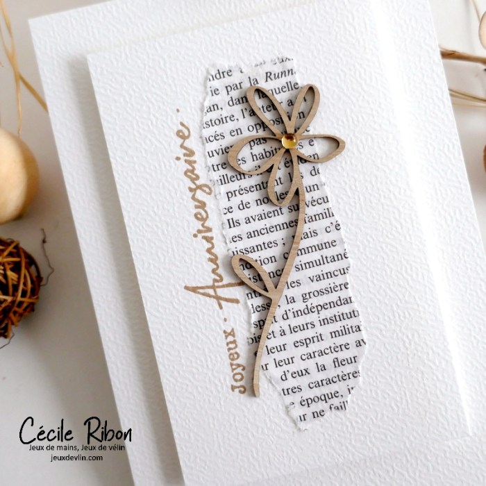 Je partage aujourd’hui une carte d’anniversaire simplissime et de style très nature. Un morceau de page de livre, une silhouette de fleur en bois (une découpe au laser), un unique strass (pour un soupçon de sophistication), un sentiment et rien de plus. La preuve qu’il ne faut parfois pas grand chose pour faire une carte.