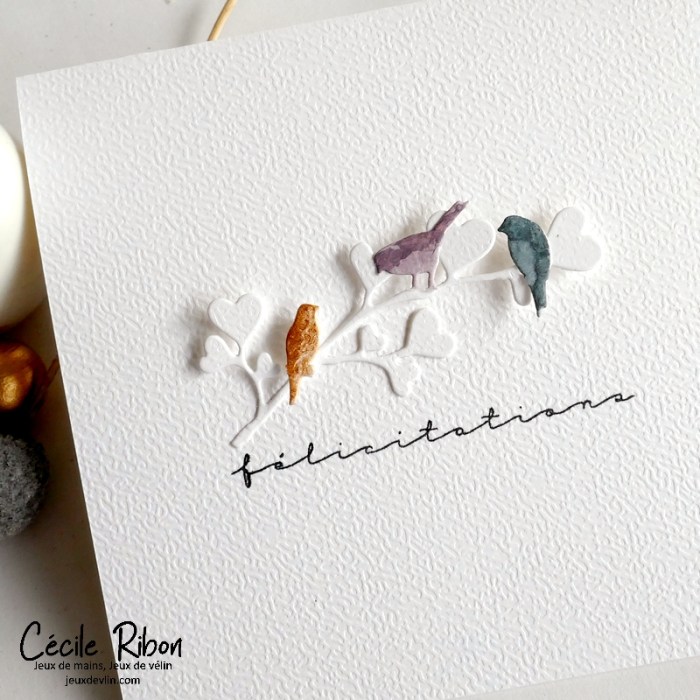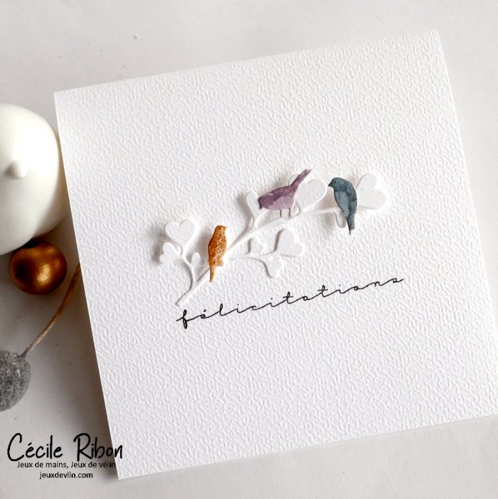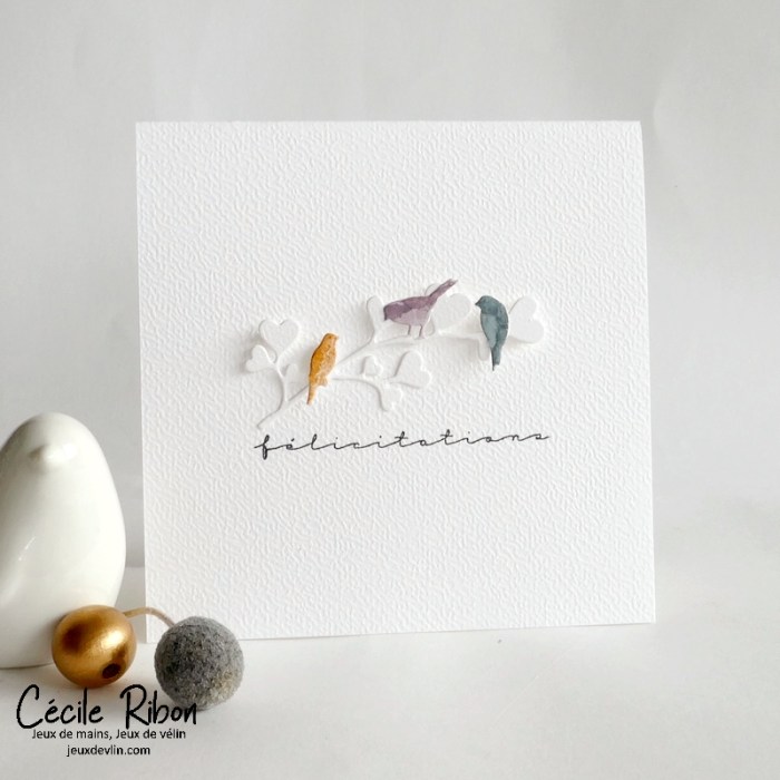 Cette fois, j’ai choisi la ligne 1 : Carré – Rose – Papillon. Ces consignes m’ont inspiré un duo de cartes de félicitations, par un mariage, par exemple.