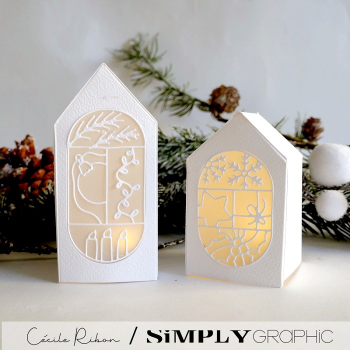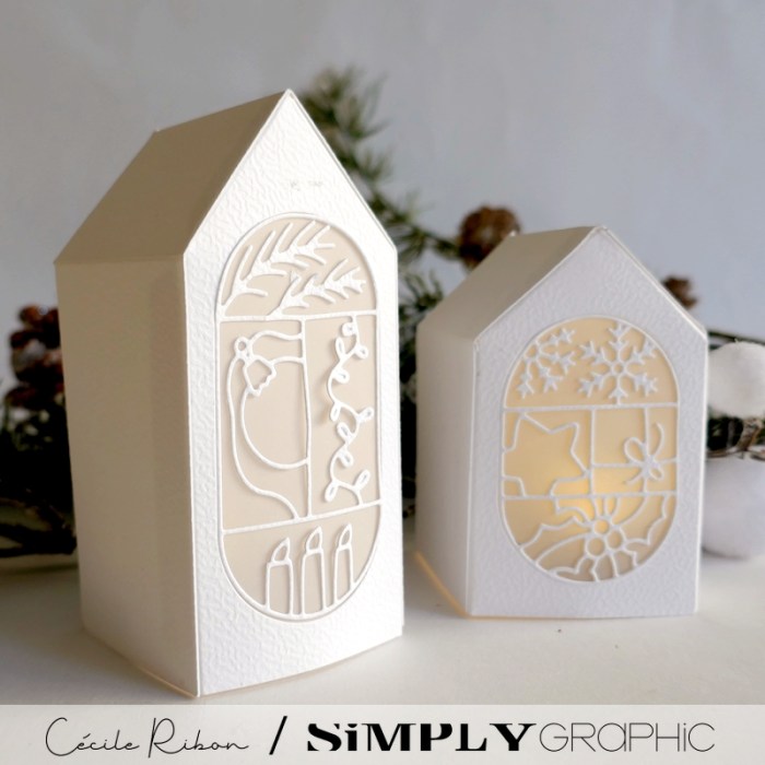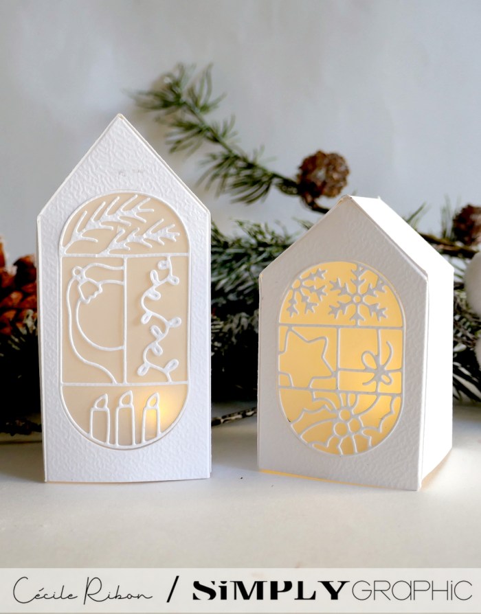 Aujourd’hui je vous montre la décoration lumineuse pour les fêtes, un duo de lumignons en forme de petites maisons, réalisés avec des schémas que j’ai conçus spécialement pour l’occasion et de superbes découpes façon vitrail.