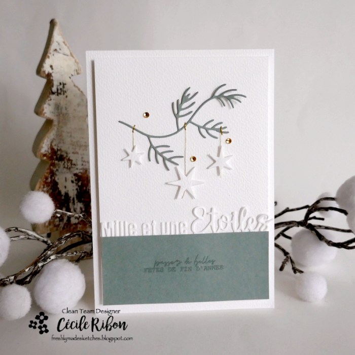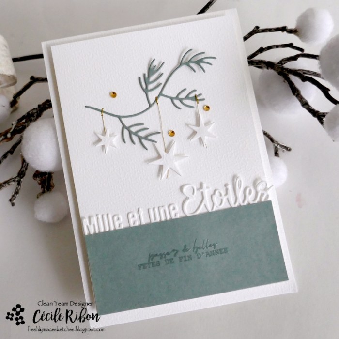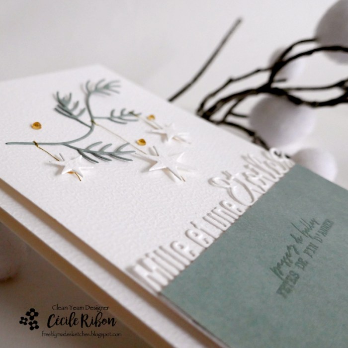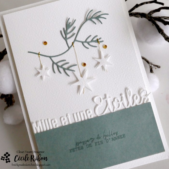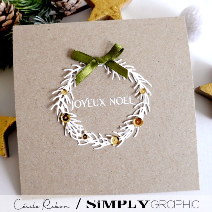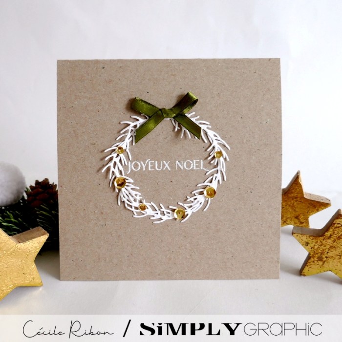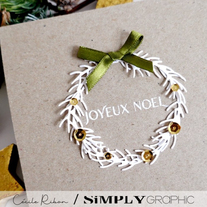 Voici ma carte pour illustrer ce combo. La couronne est réalisée avec l’une des matrices de coupe du set « branches de pin 3 ». J’ai recoupé toutes les découpes pour ne conserver que les pointes et les disposer en cercle.